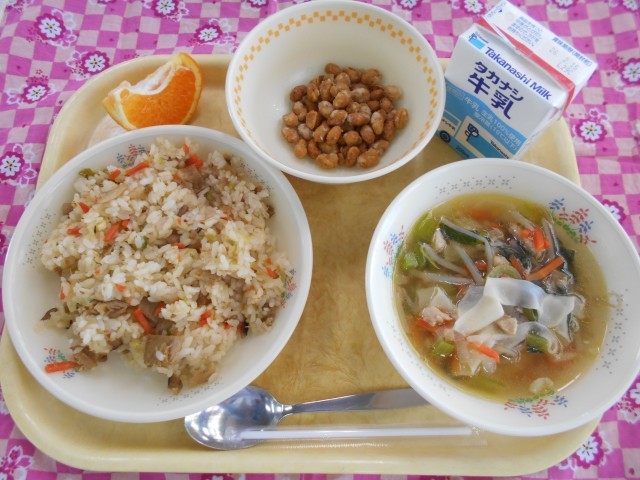 焼き豚チャーハン、フライビーンズ、ウェーブワンタンいりスープ、はるみ、牛乳