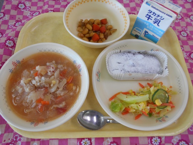 トマトリゾット、コールスローサラダ、大豆のカレーに、さつまいものブラウニー、牛乳