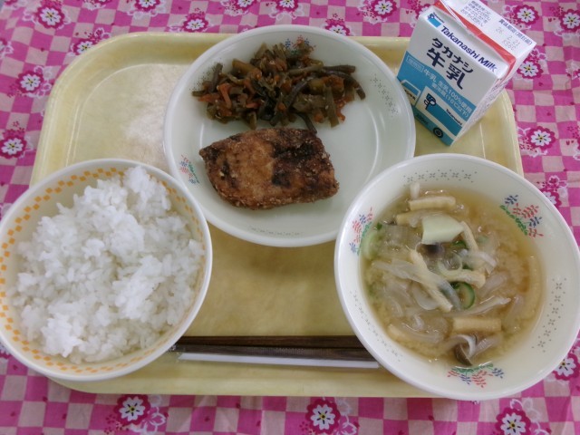 ご飯、めかじきの竜田揚げ、きんぴらに、みそ汁、牛乳