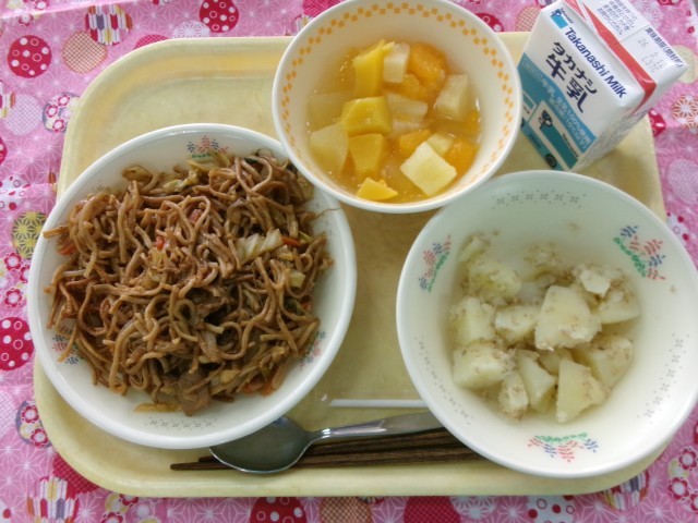ソース焼きそば、ごまこふきいも、フルーツポンチ、牛乳