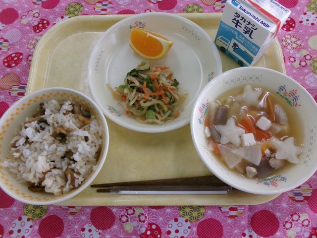 さんまご飯、わさび和え、星もちの吉野汁、清見オレンジ、牛乳