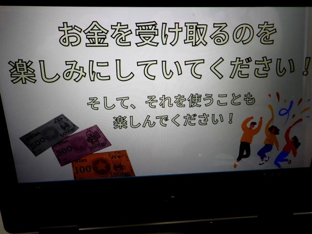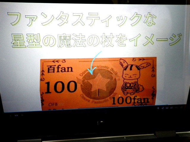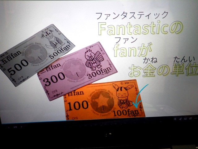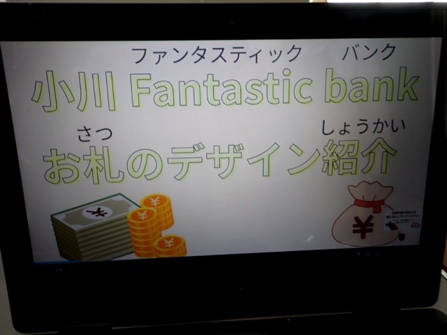 小川ハッピータウンの【公共機関】の1つである「小川 Fantastic bank」から、学校通貨(お札)の解説がありました。