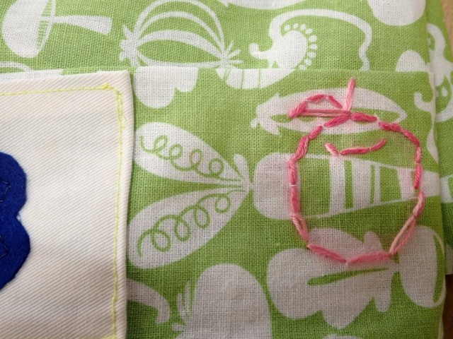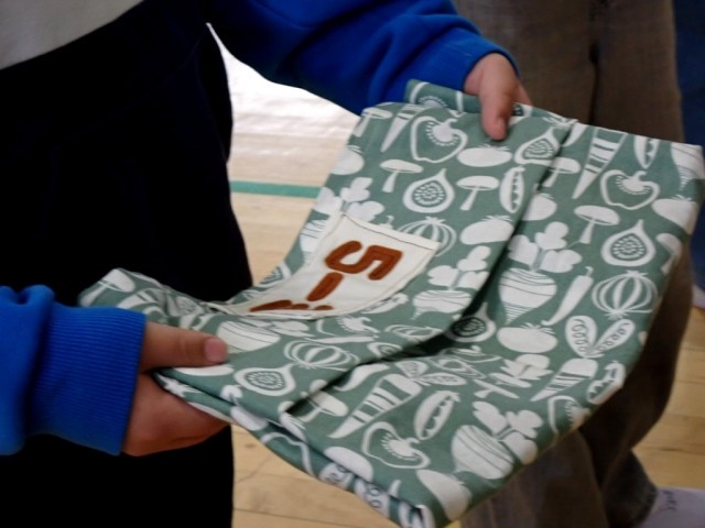 石窯ピザを販売した売上で、布を買って、各教室に置いている【給食の配膳台カバー】を製作してくれたのです。クラス名と、それぞれ異なる刺繍もポイント。