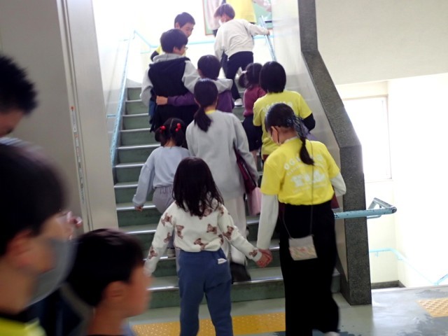 1年生たちが、6年生の待つ視聴覚室から、教室に連れていきます。