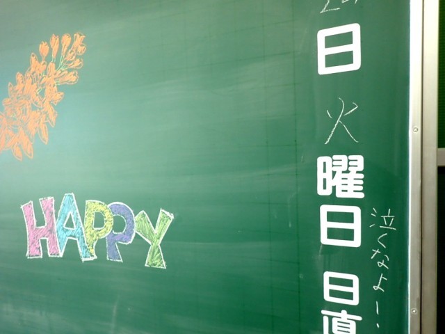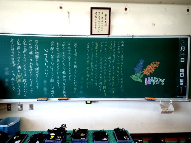 教室の黒板にはライラックと担任らからのメッセージ。
