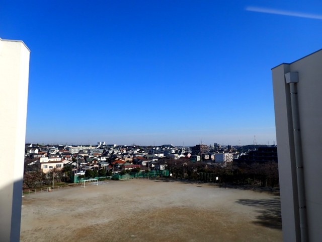 天気は最高!6年教室前の窓から見る青空。