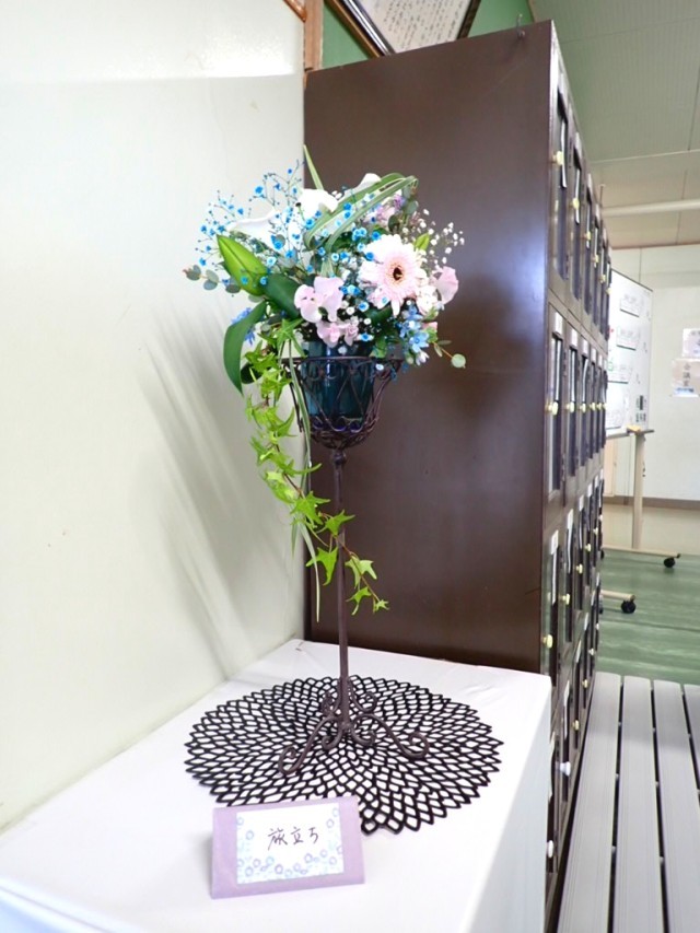 教職員、来賓玄関にはお花とメッセージ。