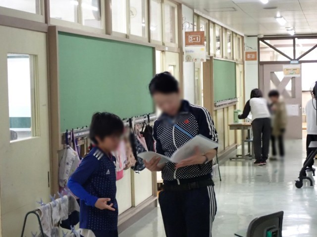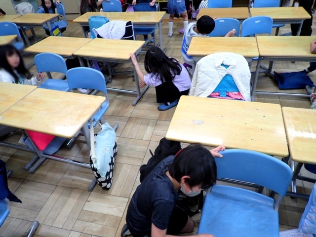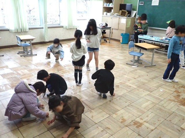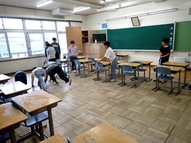 ​校内を回ると、どの教室も大掃除の真っ最中。「激落ちくん」を手に、自分が使ってきた机や椅子、床を一生懸命に磨き上げるこどもたちです。ピカピカになった教室は、この1年間の成長を映し出しているかのようです。
