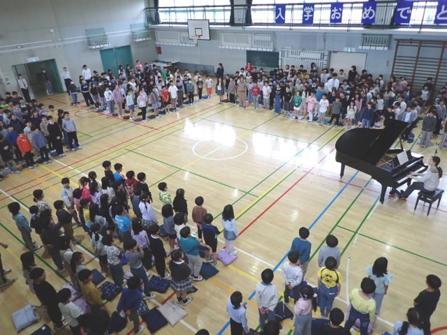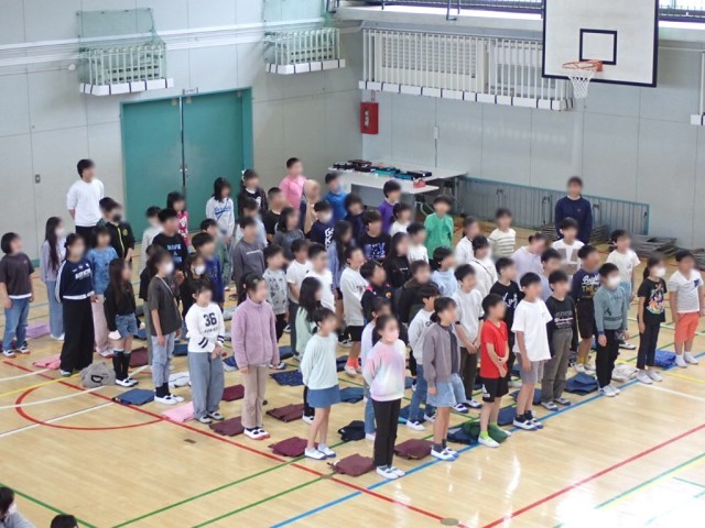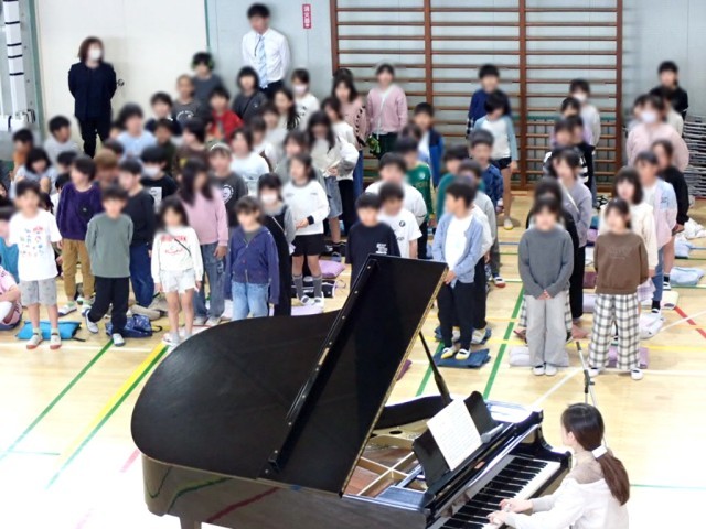 1年生を迎える会で校歌を歌うので、その練習を兼ねて「音楽集会」をしました。学年ごとに校歌を歌い、聴き合ったり、全員で歌ったりしました。