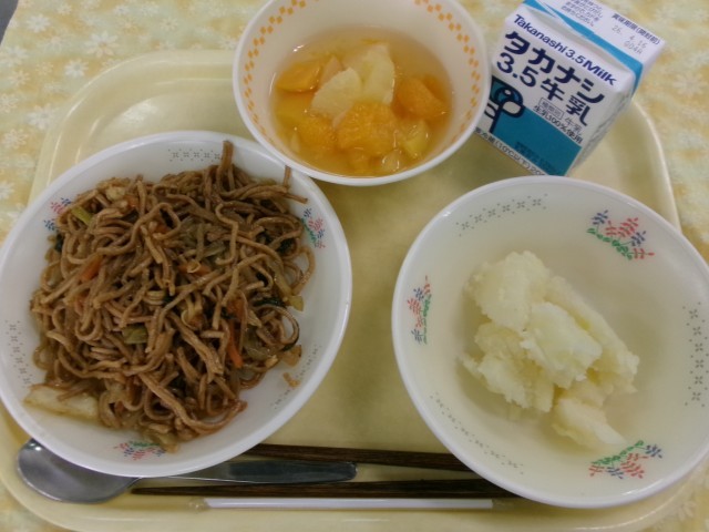 ソース焼きそば、こふきいも、フルーツポンチ、牛乳