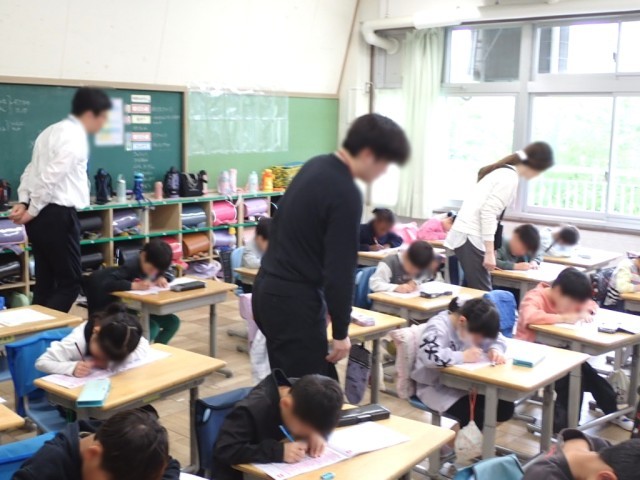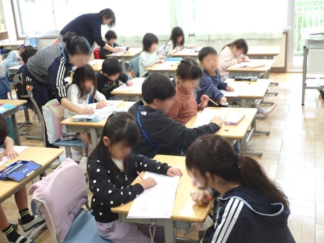 2年生は、授業のない全ての教員が入って、個別にサポート。全体指導も、ペースを崩さないように書き順や字形の指導も加えています。これまで困っていた子も、今日は表情が緩んでおり、ホッとしました。