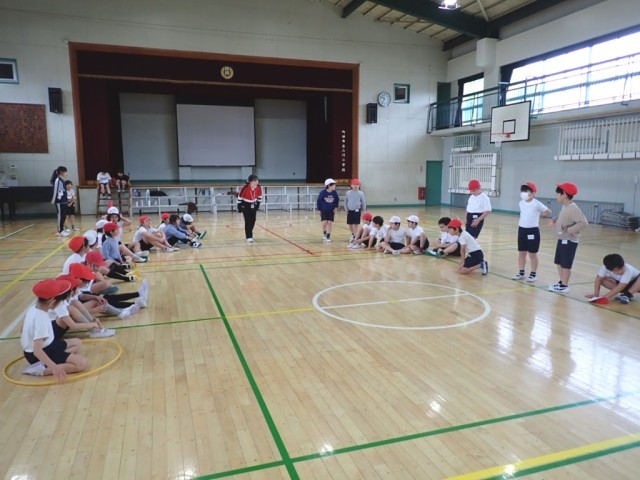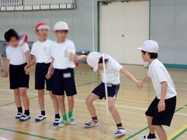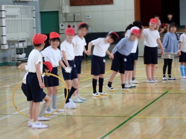 手を繋いだまま、フラフープをくぐって移動させていくゲームです。