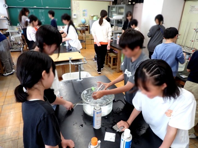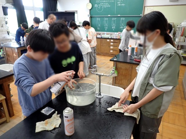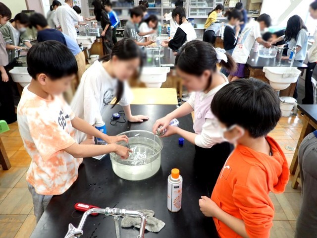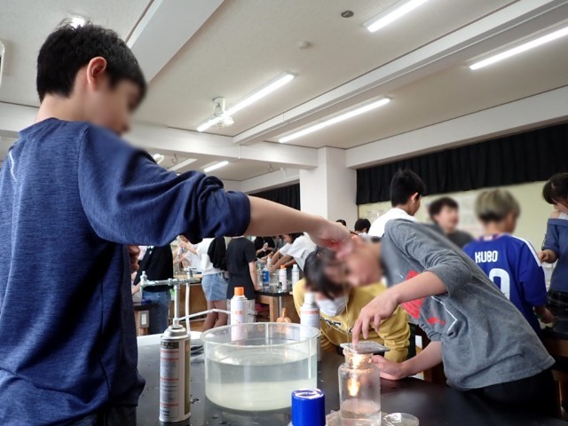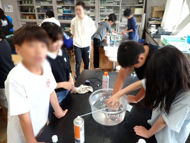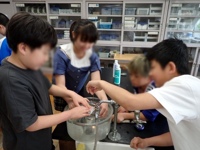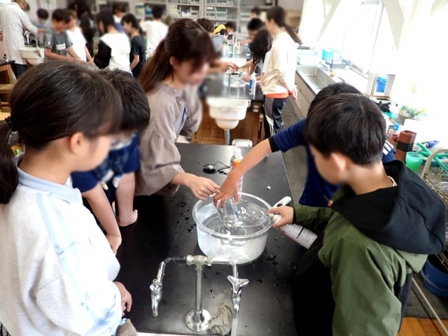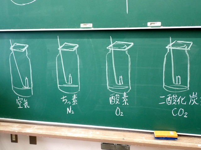 4つの気体を水上置換で集めて、火をつけたろうそくを入れ、ものを燃やす働きのある気体を探っていました。