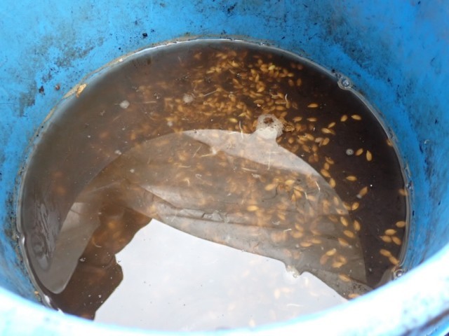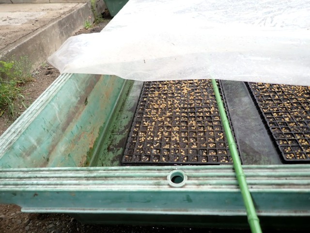 1枚目画像、トロ舟に、ふるいにかけた「黒土」と「けいふん」を入れて、発芽直前の「もち米」を撒きました。こちらは「乾田農法」で育てていきます。