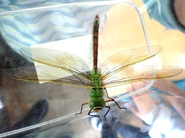 飼育ケースの中で、まだしっとりと瑞々しい輝きを放ちながら、力強く羽根を広げたギンヤンマ。