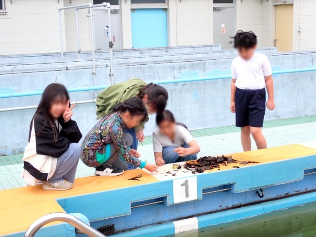 「プールに産卵場所を作ろう!」と、手作りの「抽水植物フロート」を浮かべる作戦を決行しました。