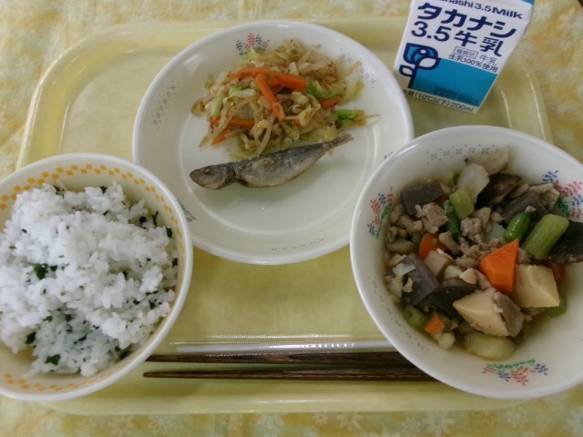 わかめご飯、春野菜のうま煮、小あじのから揚げ、おかかあえ、牛乳