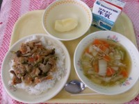 今日は豆腐の中華煮を作りました。材料は、豚肉・人参・たけのこ・干しシイタケ・えび・いか・白菜・豆腐・ねぎです。みなさんの体をつくる「赤」の仲間と体の調子を整えてくれる「緑」の仲間の食べ物をそろえました。たくさん食べてください。