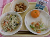 七草雑炊、さばの照り焼き、紅白なます、白玉しるこ、牛乳