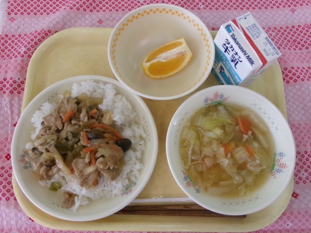 スタミナ丼、白菜のそぼろ汁、いよかん、牛乳