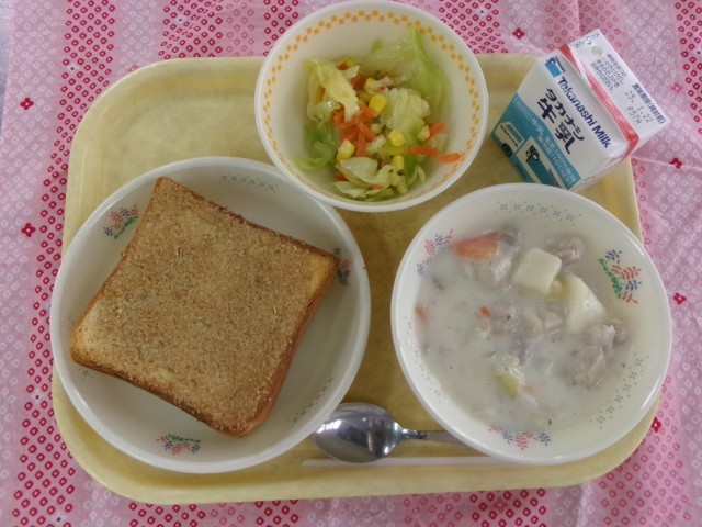 セサミトースト、チキンのクリーム煮、ハニーサラダ、牛乳