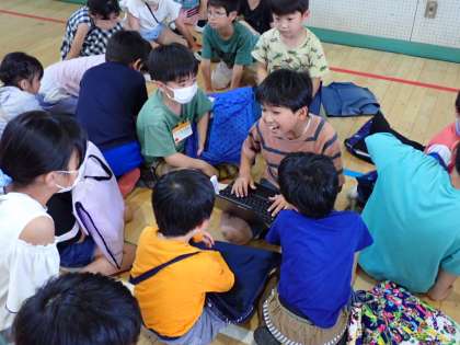 給食後、体育館に縦割り班ごとに集まって、相談をしました。