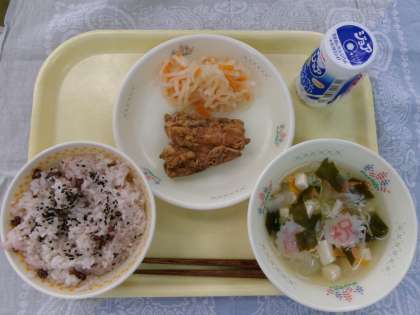 あずきおこわ、鶏肉のから揚げ、紅白なます、お祝い汁、発酵乳