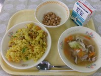 わかめご飯、生揚げのそぼろあんかけ、和風サラダ、みそ汁、牛乳