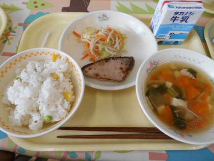 コーンと枝豆のご飯、ぶリのごまみそ焼き、野菜のしょうが醤油和え、冬瓜のすまし汁、牛乳