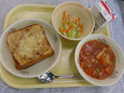 ツナマヨトースト、ハニーサラダ、トマトシチュー、牛乳