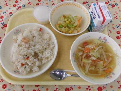 ナシゴレン、グリーンサラダ、ソトアヤム、ホワイトゼリー、牛乳