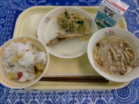 五目栗ご飯、小あじのから揚げ、おかかあえ、さつま汁、牛乳秋の味覚である栗を使った...