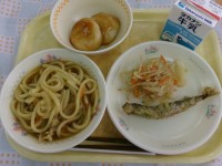カレーうどん、ししゃものいそべ揚げ、ごま酢和え、月見だんご、牛乳十五夜に合わせて...