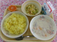 ターメリックライス、えびクリームソース、グリーンサラダ、菊花みかん、牛乳今日はタ...