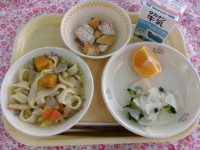 ほうとう、大根のゆず風味漬け、さつまいもの雪化粧、紅まどんな、牛乳今日は冬至にち...