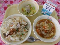 から揚げチキンピラフ、バジルドレッシングサラダ、桜パスタいりミネストローネ、牛乳...