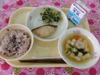 ごま塩ご飯、あじのカレー焼き、ぶどう豆、沢煮椀、牛乳今日の副菜は、ツヤツヤ光る「...