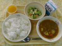ご飯、米粉のひよこ豆いりカレー、菜の花入りサラダ、オレンジゼリー、牛乳今日から2...