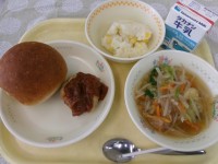 ミルクパン、こまったさんのハンバーグ、コーンポテト、野菜スープ、牛乳読書献立、「こまったさんのハンバーグ」です。みんな大好きなハンバーグ。ちょっぴりおっちょこちょいで、あわてんぼうのこまったさんが作る...
