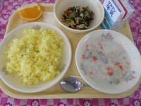 ターメリックライス、えびクリームソース、青大豆とひじきのサラダ、ネーブル、牛乳ターメリックライスと一緒に食べるとおいしい「えびクリームソース」を作りました。えびには、体を元気にするたんぱく質や、体の調...