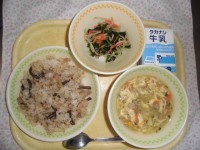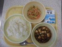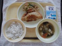 牛乳 麦ごはん ジャンボ餃子 甘酢あん 中華もやし わかめスープ
