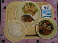 牛乳 ごはん さばのみそ煮 ごまドレサラダ あんかけ汁