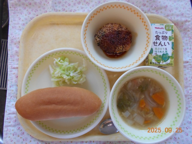 白ぶどうジュース コッペパン コロッケ ボイルキャベツ パスタスープ