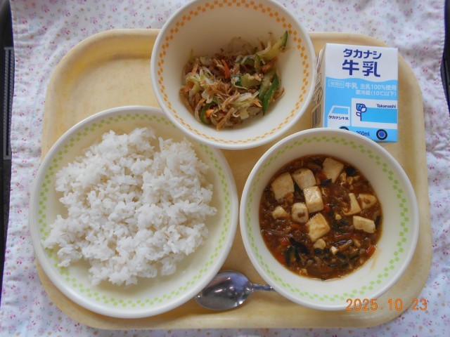 牛乳 麦ごはん 揚げごぼうのサラダ カレーマーボー豆腐