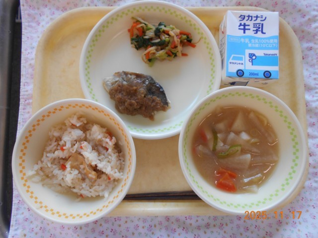牛乳 こぎつねごはん 魚のオニオンソース おひたし 根菜のみそ汁