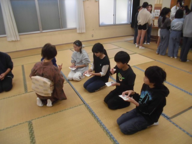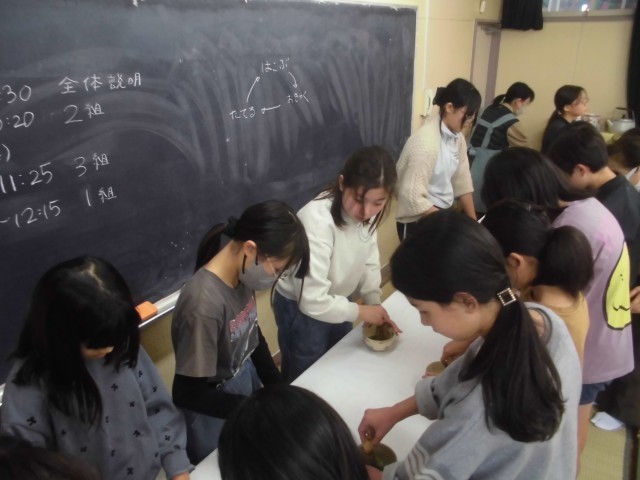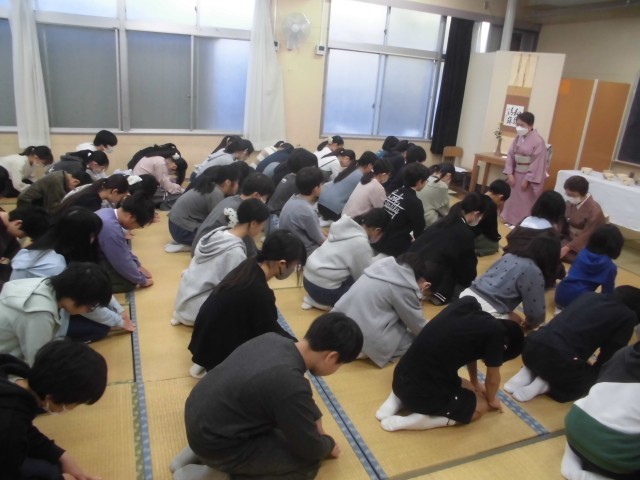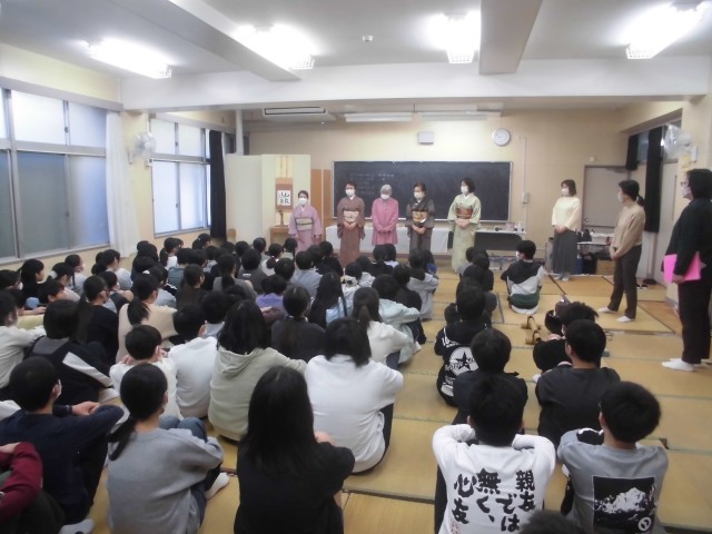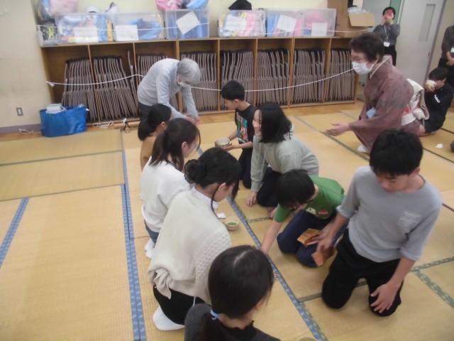 「茶友会」の方にお越しいただき、各クラス「点てる」「運ぶ」「客」の動きを3つのグループに分かれて教えてもらいました。静かに集中して学んでいる姿が見られました。