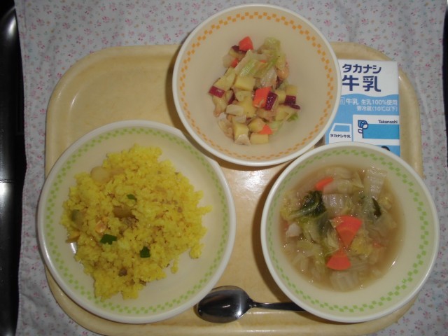 牛乳 スパイシーピラフ さつ豆サラダ 白菜とベーコンのスープ