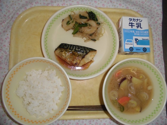 牛乳 ごはん さばのレモンソース 小松菜と春雨のナムル さつまいものみそ汁