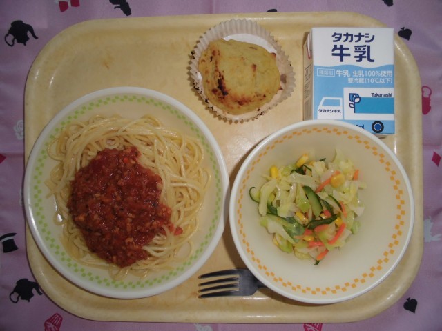 牛乳 ミートソーススパゲティ コールスローサラダ スイートビーンズポテト