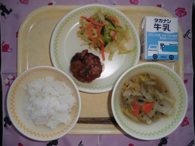 牛乳 ごはん 豆腐ハンバーグ きのこソース 和風サラダ 白菜のスープ